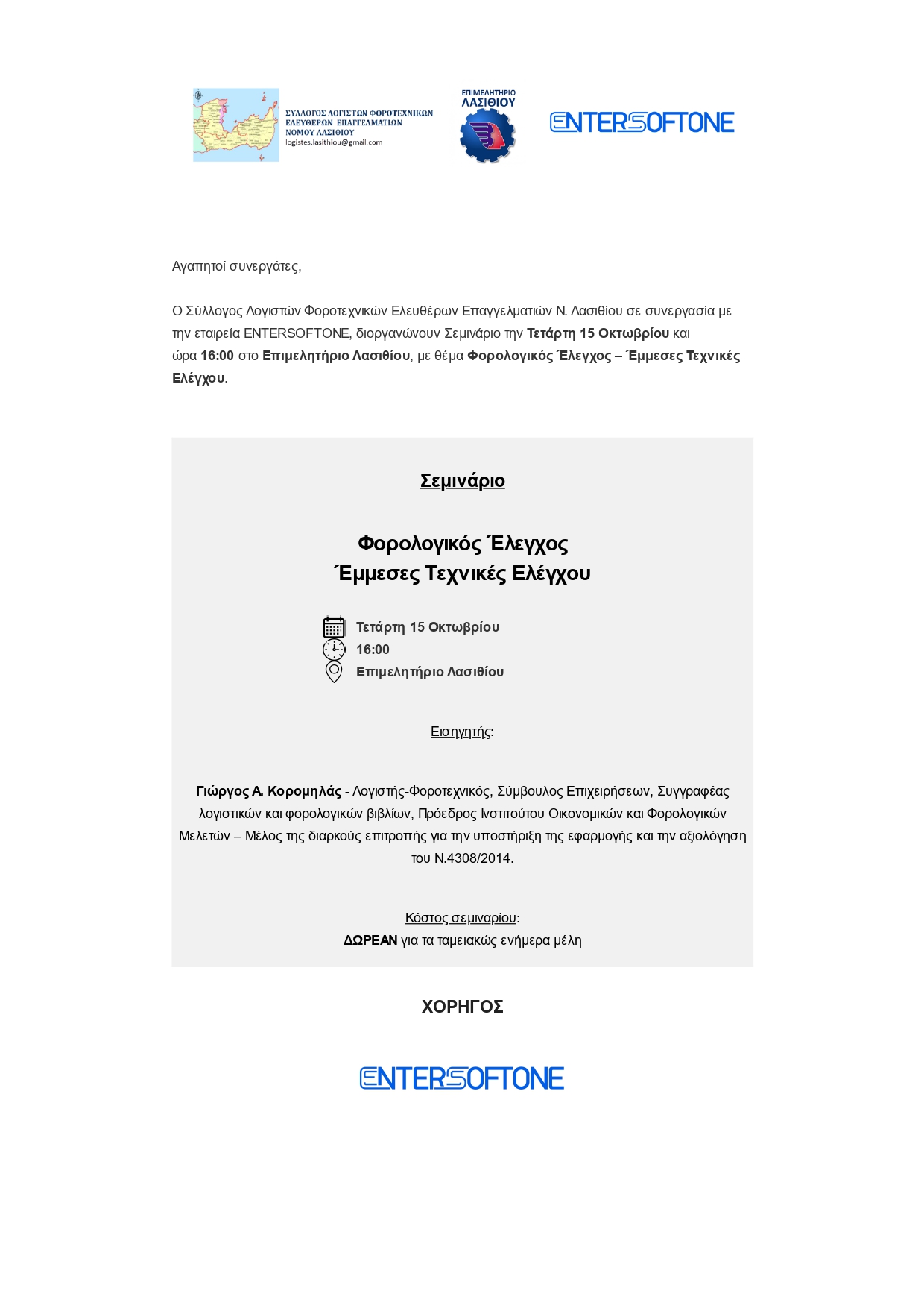 Ο Σύλλογος Λογιστών Φοροτεχνικών Ελευθέρων Επαγγελματιών Ν. Λασιθίου σε συνεργασία με την εταιρεία ENTERSOFTONE, διοργανώνουν Σεμινάριο την Τετάρτη 15 Οκτωβρίου και ώρα 16:00 στο Επιμελητήριο Λασιθίου, με θέμα Φορολογικός Έλεγχος – Έμμεσες Τεχνικές Ελέγχου.