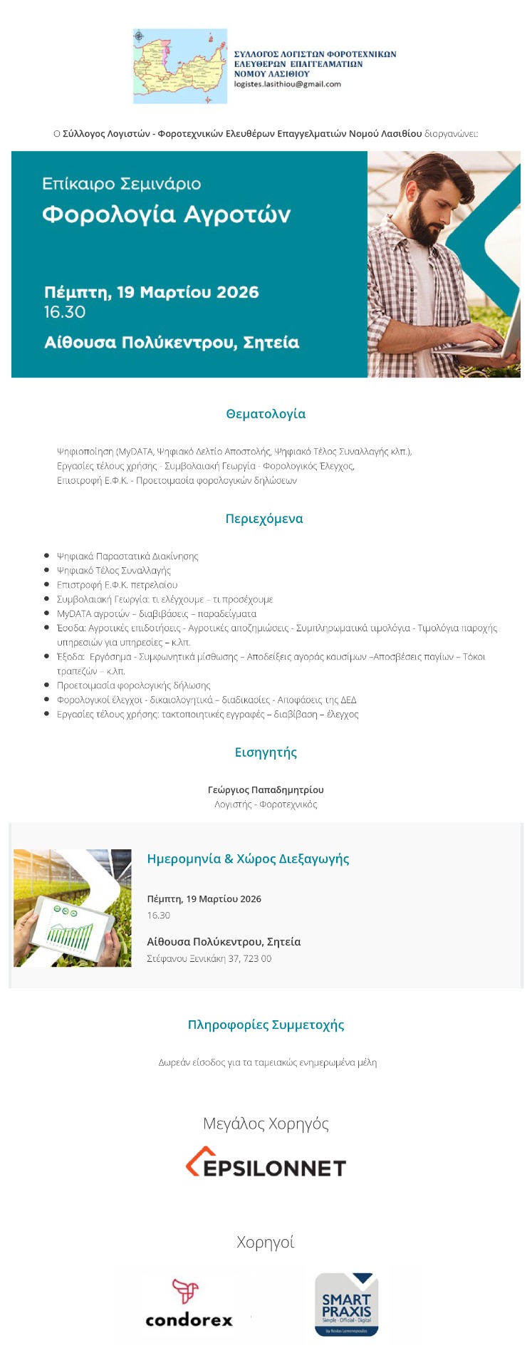Ο Σύλλογος Λογιστών - Φοροτεχνικών Ελευθέρων Επαγγελματιών Νομού Λασιθίου διοργανώνει επίκαιρο επιμορφωτικο σεμινάριο με Θεμα :